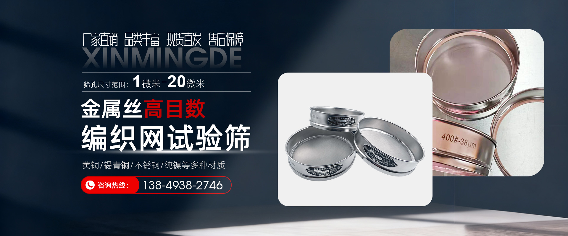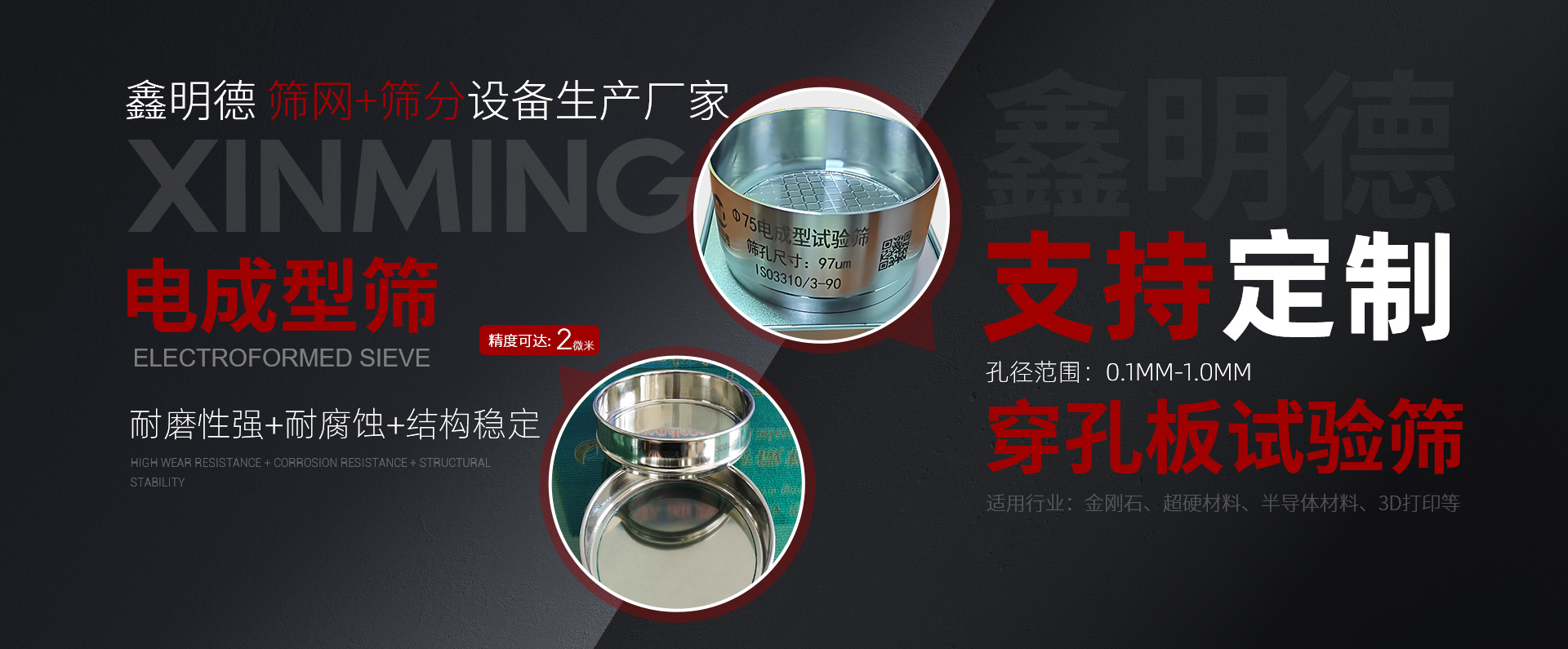 新鄉市鑫明德機械有限公司位于河南省新鄉市高新技術開發區2號創業園,是一家研發,生產,銷售各種材質“不銹鋼網,精密篩網(2目-800目),試驗篩,篩分檢具,振動設備”為主的高新技術企業,本廠技術力量雄厚,生產工藝先進,檢測設備齊全,本公司產品通過了出口歐盟ROHS認證和CE認證,通過了 ISO9001-2015認證。產品嚴格貫徹GB/T5330-2012,符合國際標準ISO3310生產。本公司已取得......